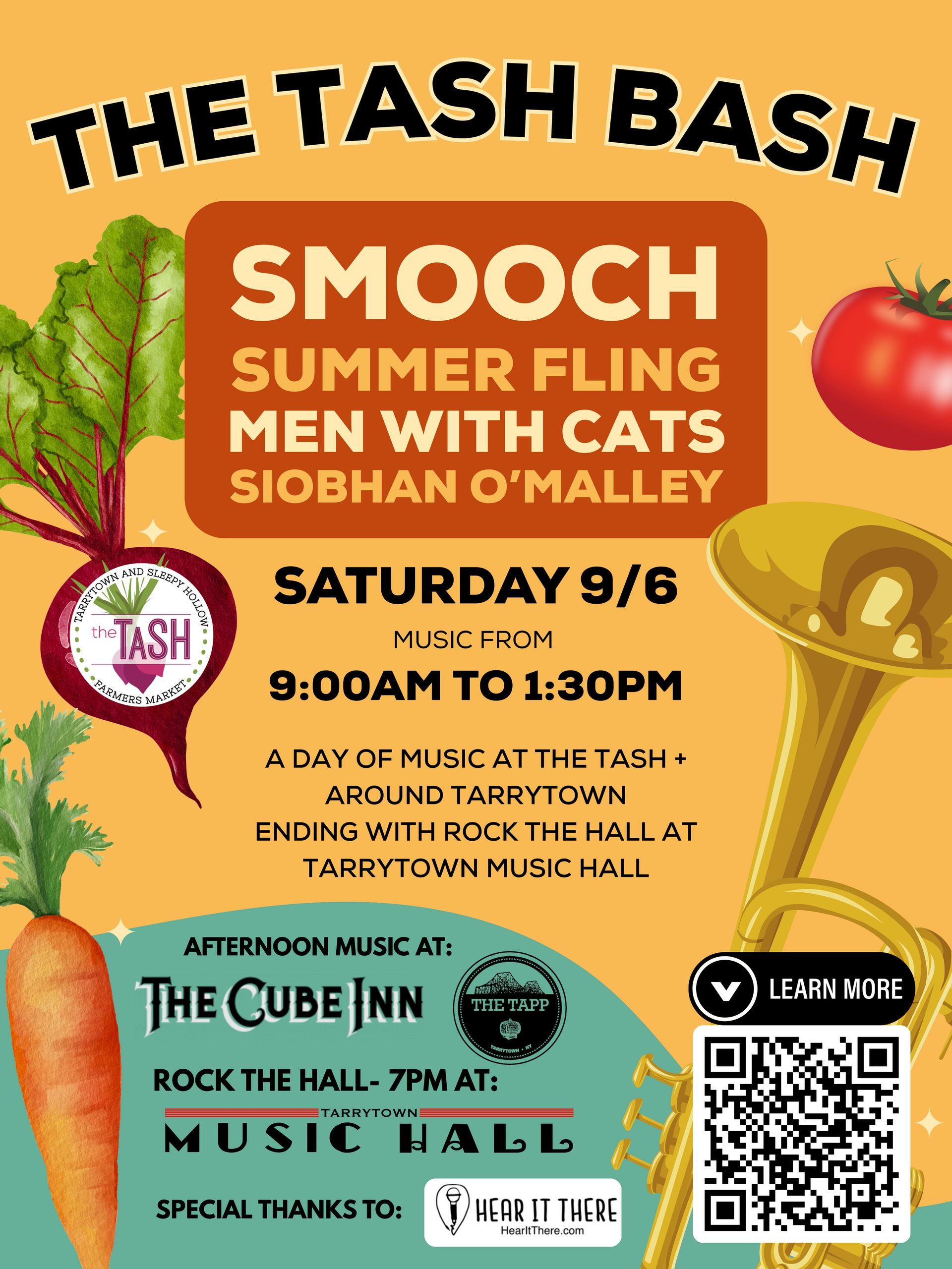 It’s a full day of live music across Tarrytown on Saturday (see the Cube Inn & Rock the Hall notes in the flyer) and it starts at the award-winning TaSH Farmers Market stage at 9a. Come down, grab your morning coffee and some fresh fruit & veg while you get into the weekend groove nice and early (and don’t miss Summer Fling’s set, trust us).