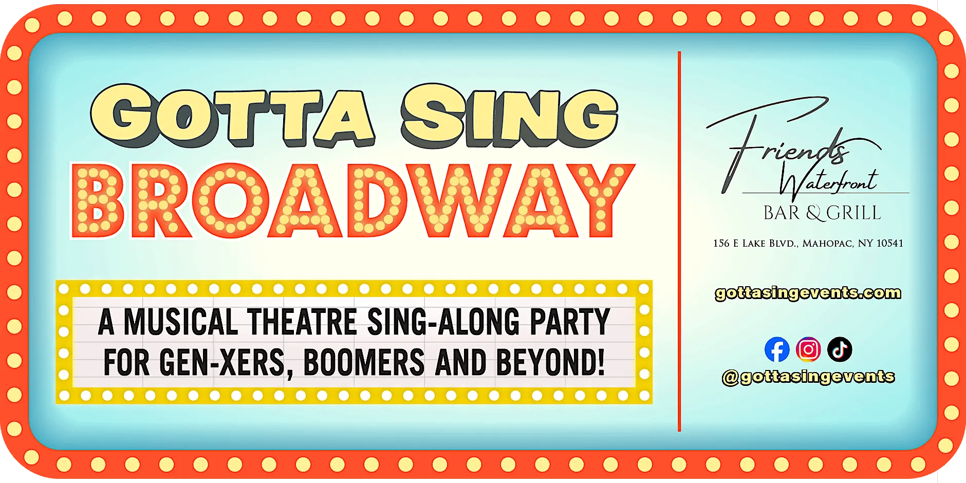Calling all show tune and musical lovers! Gotta Sing: BROADWAY hosts a sing-along this Saturday night at Mahopacās Friends Waterfront Bar & Grill. Unlike karaoke, lyrics fill the whole room and everyone sings together to the original cast recordings, no solo mic required. Events are geared for GenXers, Baby Boomers and beyond.
