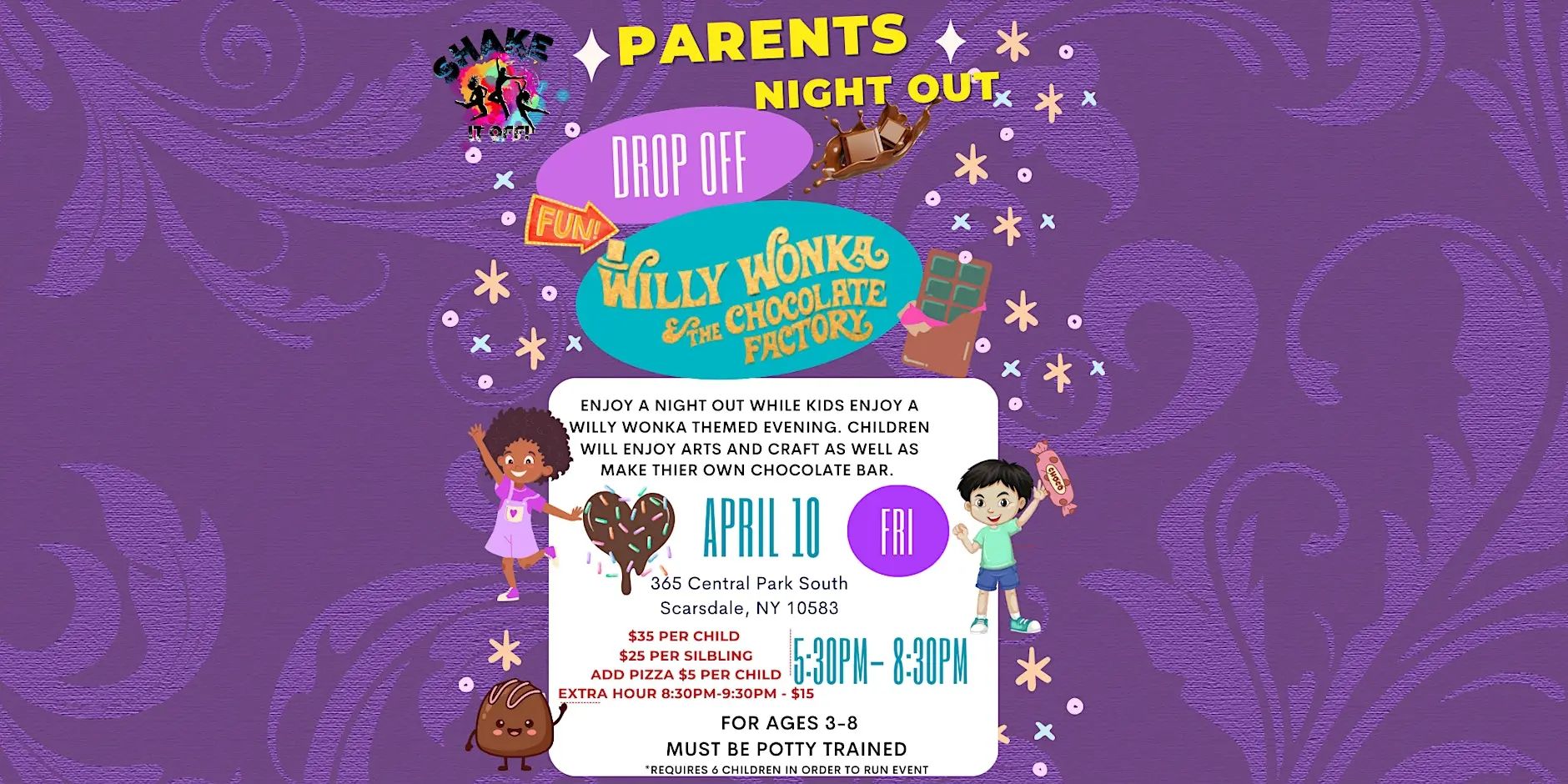 Drop off kids ages 3-8 for a Willy Wonka-themed evening at Shake It Off in Scarsdale and enjoy a night out. Children make their own custom chocolate bar, play themed games, and dance with friends in this supervised event.