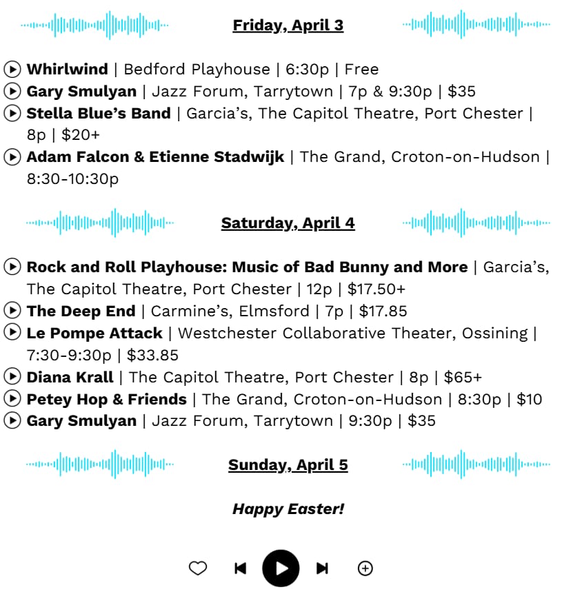 We love to hear from you! Give us a shout at [email protected] or reach us on Instagram @lovingwestchester. And don’t forget to forward this on to a friend who’s always asking “what’s going on this week?”