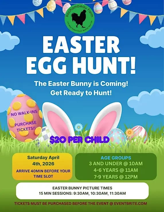 Rochambeau Farm hosts its annual Easter egg hunt with age-divided timed sessions, an Easter Bunny appearance, and food from Pizza Girls on-site. Timed slots are available for different age groups so kids hunt with peers at their own pace.