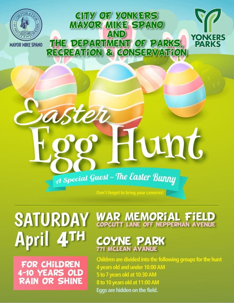 The Yonkers Parks Department holds its annual egg hunt for children ages 4 to 10 at two locations simultaneously, with kids divided into three age-based waves starting at 10a, 10:30a, and 11a.