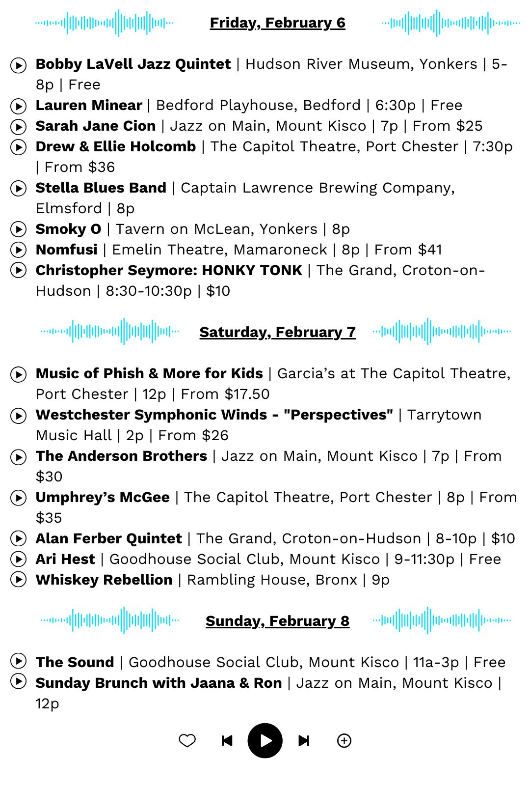 Check us out on Instagram for additional highlights outside of our normal Tuesday & Friday e-mails and, as always, please send this along to a friend who’s always asking, “What’s going on this week?”