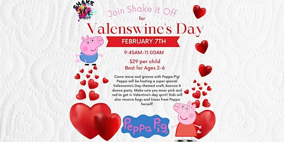 Peppa Pig drops by Scarsdale’s Shake It Off for a special Valenswine’s Day-themed craft, bounce, and dance party that will keep the whole family entertained. Guests are encouraged to wear pink and red in honor of the holiday!