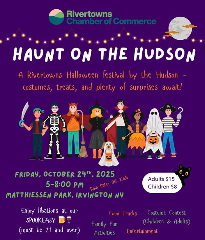 The Rivertowns host this year’s Halloween celebration in Irvington’s Matthiessen Park with festivities including costume contests, live music, family-friendly activities, food trucks and a “Spookeasy” for older guests.
