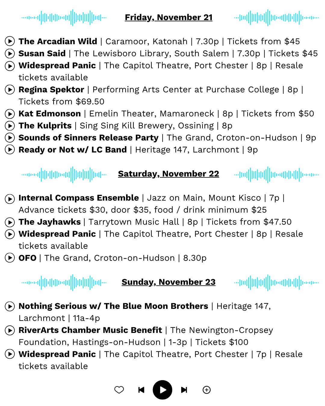 Check us out on Instagram for additional highlights outside of our normal Tuesday & Friday e-mails and, as always, please send this along to a friend whoâs always asking, âWhatâs going on this weekend?â