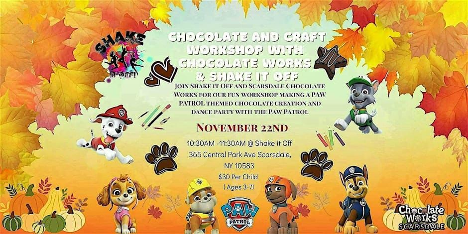 Shake It Off and Scarsdale Chocolate Works team up this weekend for a Paw Patrol-themed morning event, complete with a chocolate craft session, bounce time and a dance party with a special visit from Chase!